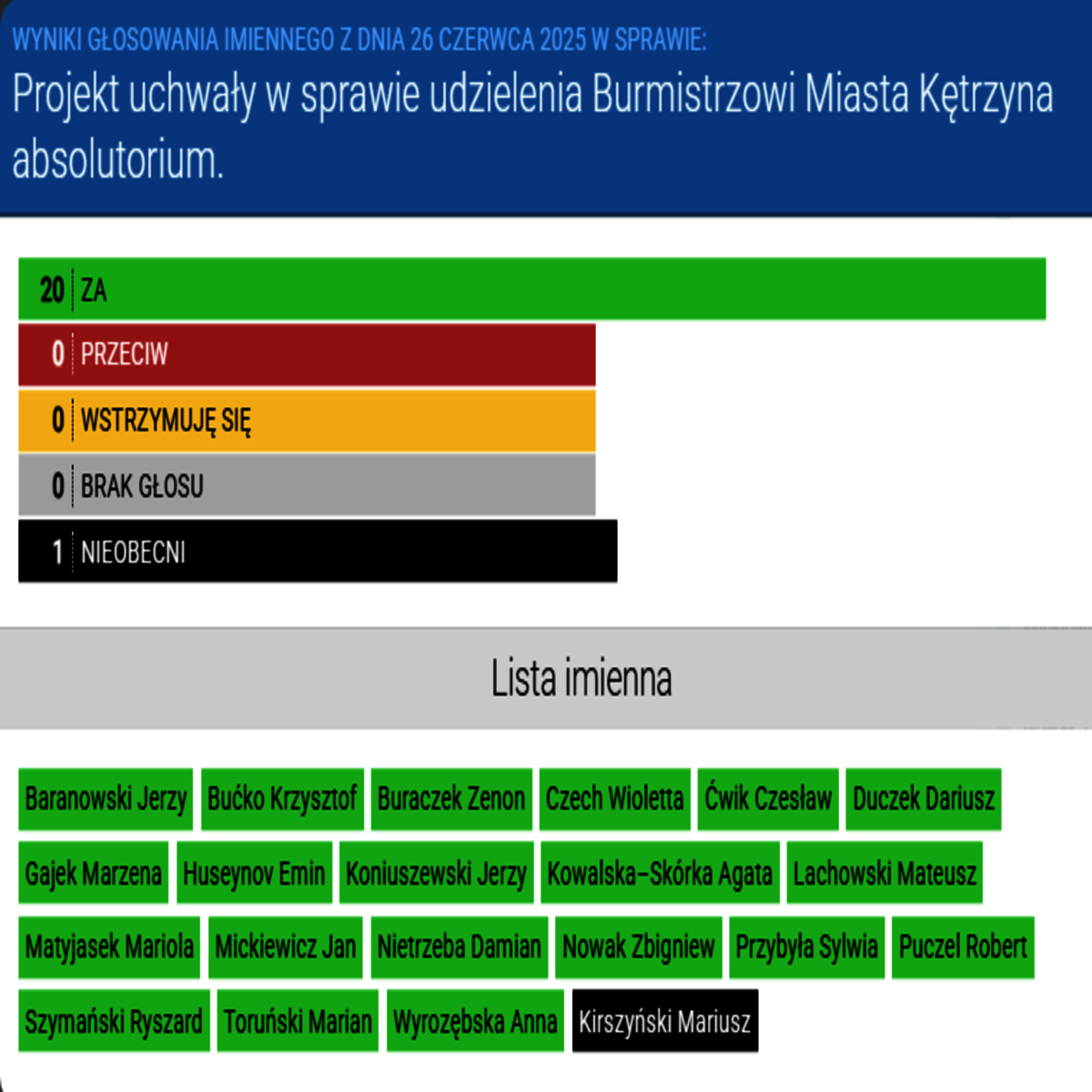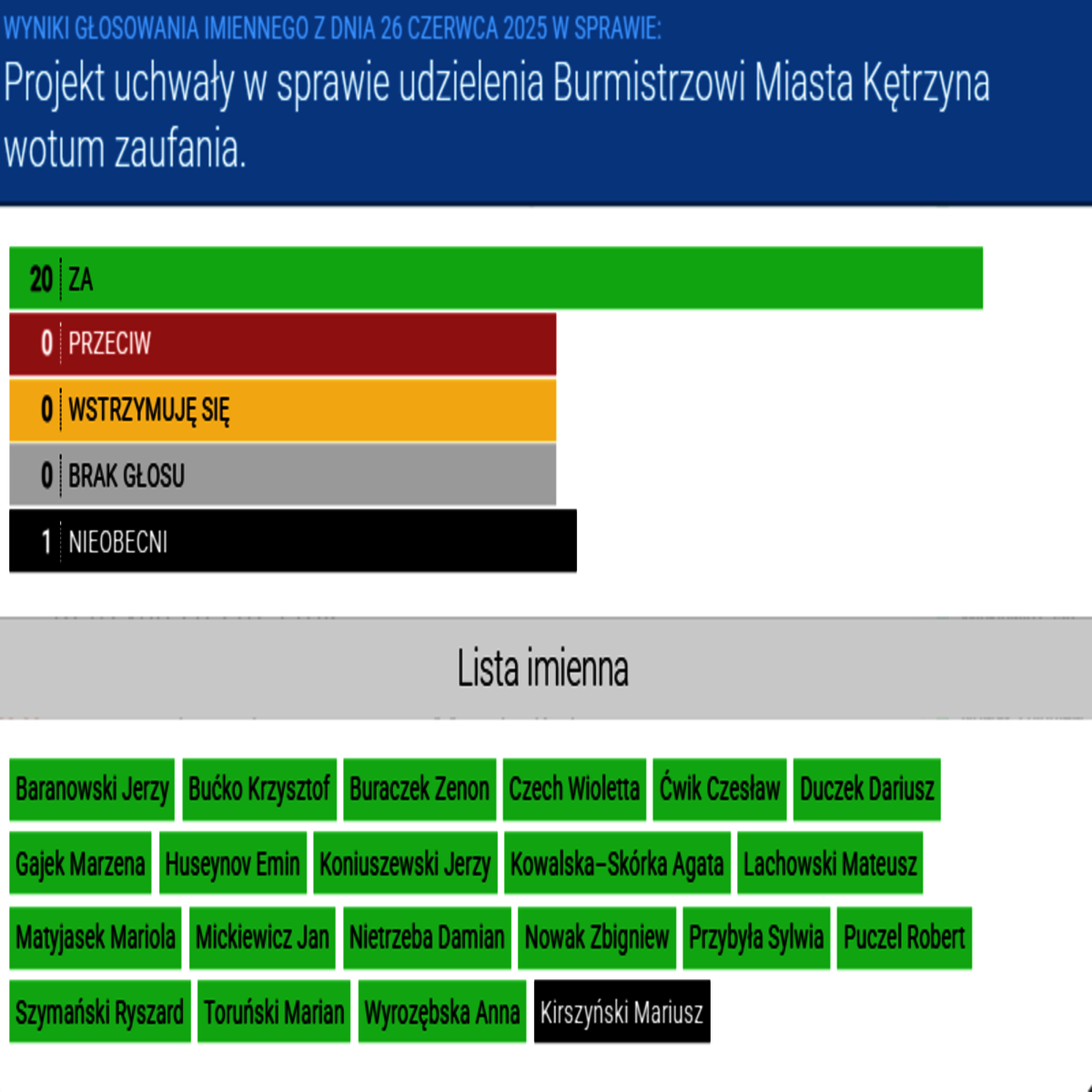 Wynik głosowania to wyraźny sygnał zaufania do podejmowanych działań oraz potwierdzenie skutecznej realizacji inwestycji i odpowiedzialnego zarządzania finansami publicznymi. Jednogłośne udzielenie wotum zaufania i absolutorium świadczy o poparciu Rady Miejskiej dla obranych kierunków rozwoju Kętrzyna oraz dobrej współpracy między organem wykonawczym a organem stanowiącym miasta.