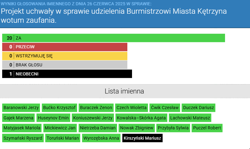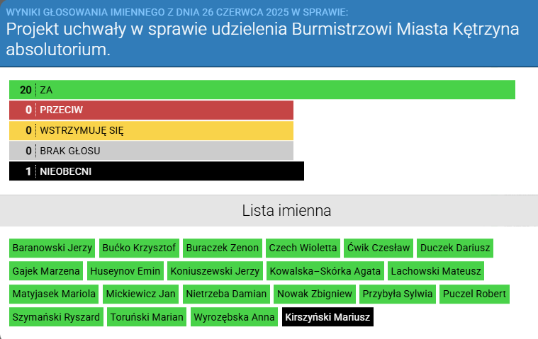 Podczas XIX sesji Rady Miejskiej w Kętrzynie, która odbyła się 26 czerwca 2025 roku, radni jednogłośnie udzielili Burmistrzowi Miasta Kętrzyna Karolowi Lizurejowi wotum zaufania oraz absolutorium z tytułu wykonania budżetu za 2024 rok.