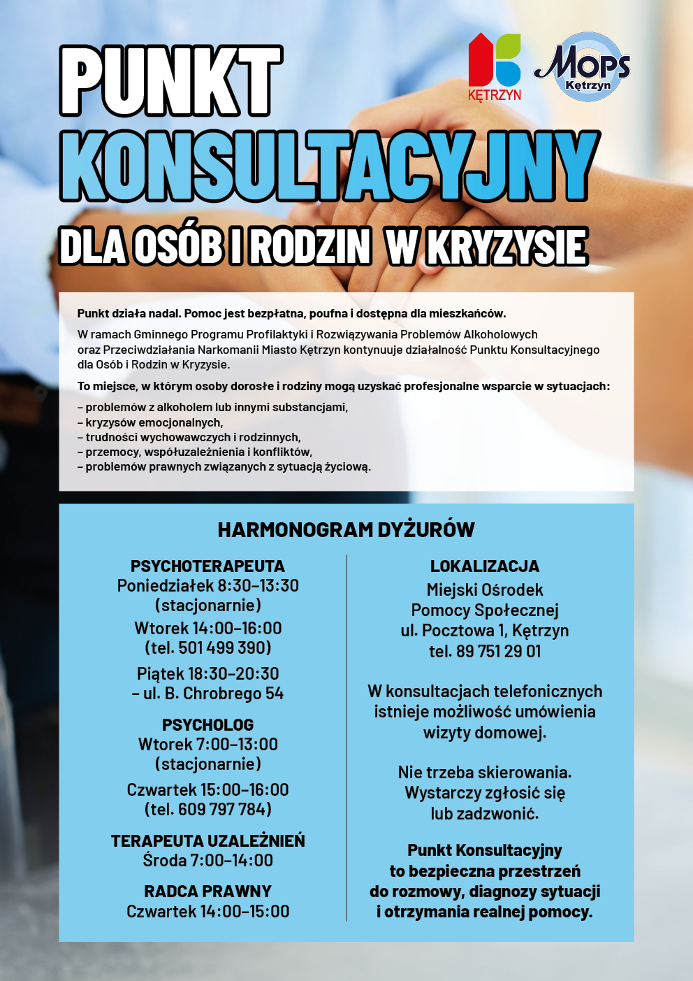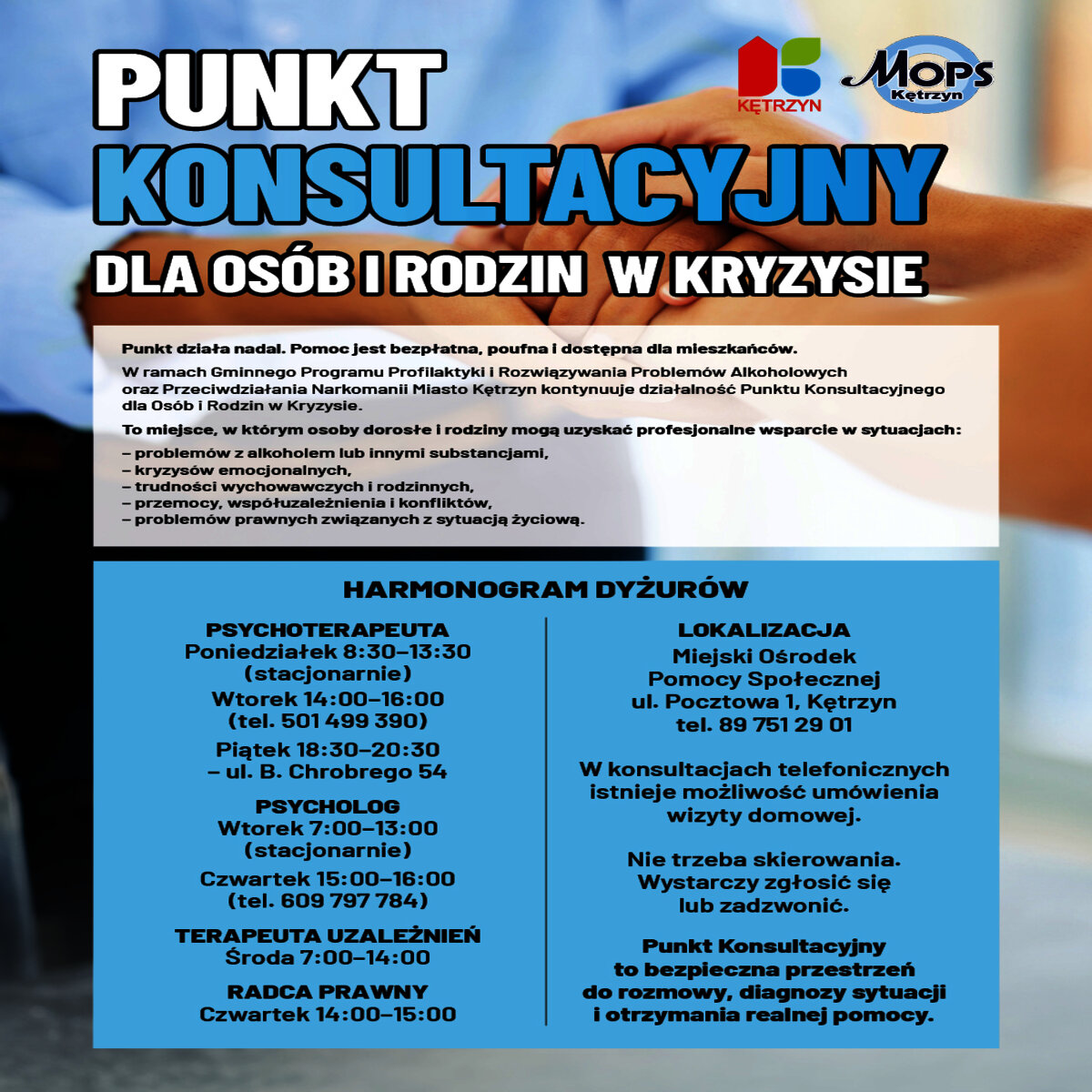 Miasto Kętrzyn kontynuuje działalność Punktu Konsultacyjnego dla Osób i Rodzin w Kryzysie w ramach Gminnego Programu Profilaktyki i Rozwiązywania Problemów Alkoholowych oraz Przeciwdziałania Narkomanii. Punkt Konsultacyjny to bezpieczna i przyjazna przestrzeń, w której mieszkańcy mogą uzyskać bezpłatną, poufną i profesjonalną pomoc. Z oferty mogą skorzystać osoby dorosłe oraz rodziny znajdujące się w trudnej sytuacji życiowej.
