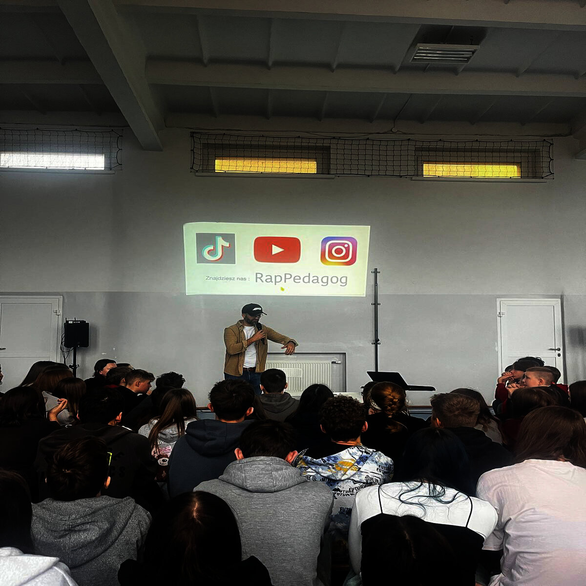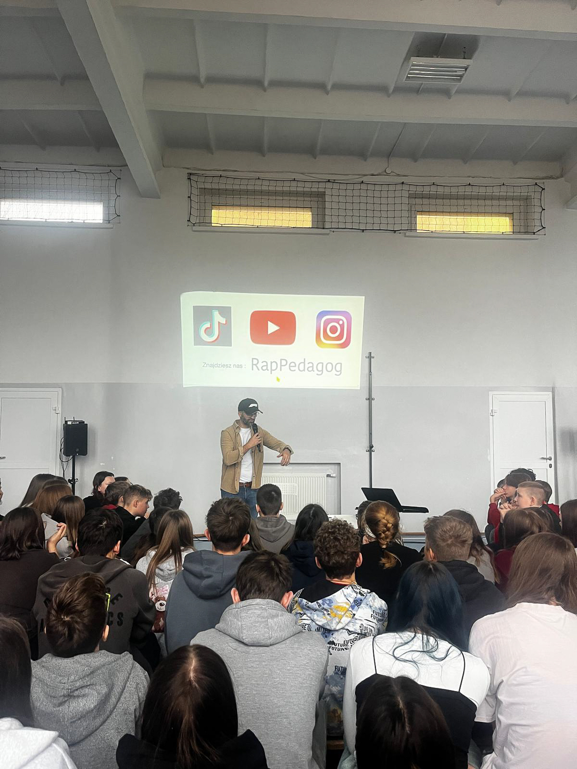 Podczas zajęć omówiono kluczowe zagadnienia dotyczące współczesnych zagrożeń rozwojowych młodzieży. W szczególności zwrócono uwagę na czynniki ryzyka, takie jak presja rówieśnicza, przemoc emocjonalna, poczucie osamotnienia oraz trudności w budowaniu własnej tożsamości. Równocześnie podkreślono znaczenie czynników ochronnych, do których należą stabilne i wspierające relacje rodzinne, wzajemny szacunek, umiejętność komunikowania się z dorosłymi, wdzięczność oraz świadome podejmowanie decyzji. Bezpośredni i autentyczny przekaz RapPedagoga wzmocnił w uczniach refleksję nad ich codziennymi wyborami oraz nad tym, jak budować odporność psychiczną. W Miejskiej Bibliotece Publicznej odbyło się również spotkanie dla rodziców. Dobromir Makowski wskazał na znaczenie roli rodziny jako podstawowego czynnika chroniącego w życiu młodego człowieka. Omówił najważniejsze obszary wymagające szczególnej uwagi ze strony dorosłych,
