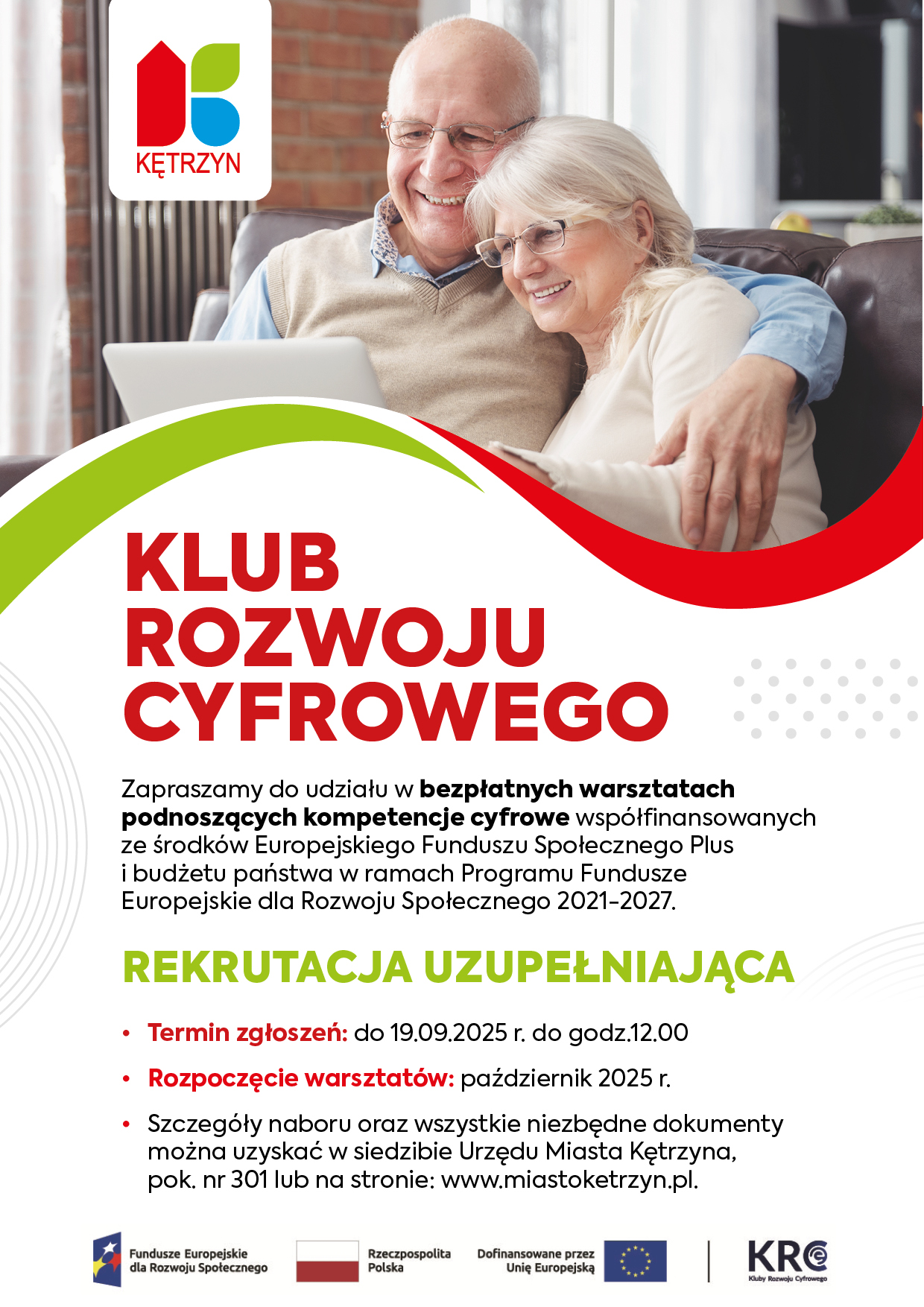 Zgodnie z Regulaminem Rekrutacji i Uczestnictwa w Projekcie „Utworzenie Klubu Rozwoju Cyfrowego w Kętrzynie” współfinansowanego ze środków Europejskiego Funduszu Społecznego Plus i budżetu państwa w ramach programu Fundusze Europejskie dla Rozwoju Społecznego 2021-2027 ogłaszamy nabór uzupełniającydo udziału w bezpłatnych warsztatach podnoszących kompetencje cyfrowe.