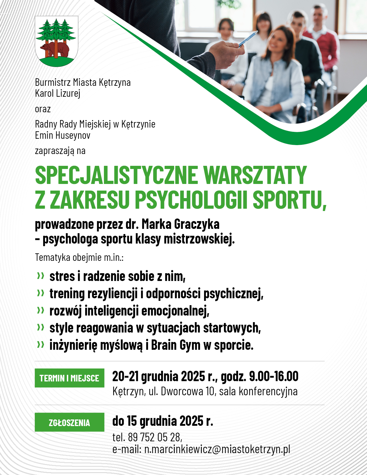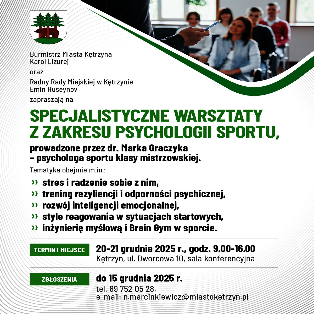 Karol Lizurej – Burmistrz Miasta Kętrzyn oraz Emin Huseynov – Radny Rady Miejskiej w Kętrzynie zapraszają trenerów i instruktorów do udziału w specjalistycznych warsztatach z zakresu psychologii sportu.