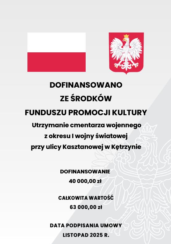 Gmina Miejska Kętrzyn na podstawie umowy o dofinasowanie nr 112943/25/FPK/DDZ realizuje zadanie pn. „Utrzymanie cmentarza wojennego z okresu I wojny światowej przy ulicy Kasztanowej w Kętrzynie”dofinansowanego ze środków Ministra Kultury i Dziedzictwa Narodowego pochodzących z Funduszu Promocji Kultury w ramach programu Groby i cmentarze wojenne w kraju 2025”.