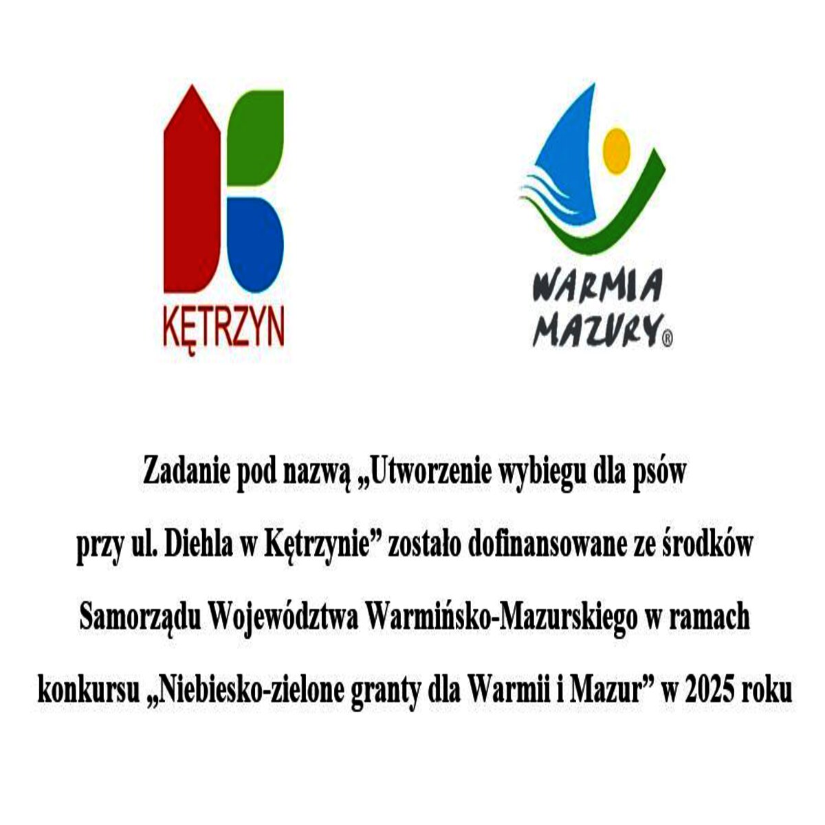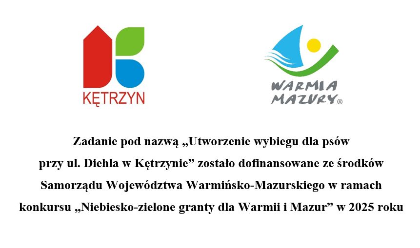 Zadanie pod nazwą „Utworzenie wybiegu dla psów przy ul. Diehla w Kętrzynie” zostało zrealizowane w ramach przyznanej pomocy finansowej Samorządu Województwa Warmińsko-Mazurskiego w konkursie „Niebiesko-zielone granty dla Warmii i Mazur” w 2025 roku”.